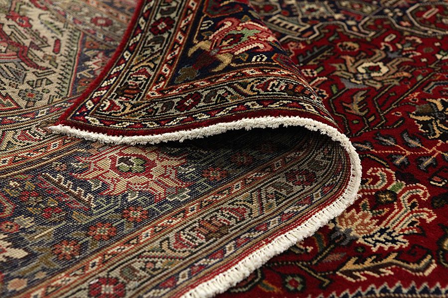 Tapis Tabriz: La ville Tabriz est la capitale de la province Azerbaïjan au sud-ouest d’Iran. Jusqu’à la fin de l’époque des caravanes Tabriz était le centre le plus important du commerce et du tissage des tapis. Par ici l’Ouest s’approvisionnait les chefs d’œuvres que des tisseurs renommés et capables tissent. Leurs qualités élevées ont fait les tapis connus aux marchés internationaux. Des atéliers des tapis noués à la main ont été crées où ils tissent de vieux et de nouveaux dessins avec une très grande densité en nœuds avec des matériaux de qualité excellente. La soie et la laine qualintative fine font les tapis de première classe. C’est la seule ville de Perse qui produit un si grand volume et et une si grande variété des tapis. Les tapis Tabriz sont impossants et ils ont leur style et leur originalité avec ou sans médaillon, avec des dessins pleins de l’imagination et de l’unicité des fleurs, des répresentations, des strophes, des poèmes à des couleurs comme le beige, le bleu et le rouge
