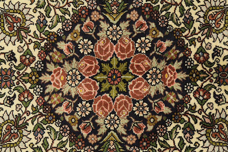 Tapis Tabriz: La ville Tabriz est la capitale de la province Azerbaïjan au sud-ouest d’Iran. Jusqu’à la fin de l’époque des caravanes Tabriz était le centre le plus important du commerce et du tissage des tapis. Par ici l’Ouest s’approvisionnait les chefs d’œuvres que des tisseurs renommés et capables tissent. Leurs qualités élevées ont fait les tapis connus aux marchés internationaux. Des atéliers des tapis noués à la main ont été crées où ils tissent de vieux et de nouveaux dessins avec une très grande densité en nœuds avec des matériaux de qualité excellente. La soie et la laine qualintative fine font les tapis de première classe. C’est la seule ville de Perse qui produit un si grand volume et et une si grande variété des tapis. Les tapis Tabriz sont impossants et ils ont leur style et leur originalité avec ou sans médaillon, avec des dessins pleins de l’imagination et de l’unicité des fleurs, des répresentations, des strophes, des poèmes à des couleurs comme le beige, le bleu et le rouge
