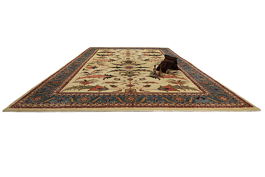 Tapis Sultanabad: À la province Farahan se trouve la ville Arak qui a 5.000 habitants, qui était connue comme Sultanabad. Cette ville est bâtie sur les ruines d’une petite ville qui s’appellait Daskerah. Aujourd’hui la ville Arak dont son nom signifie la bonne terre est une ville qui a des sols fertiles. Dans la ville Arak il y a la citadelle Soltan Abad dont la muraille a 7 métres d’épaisseur. Les tapis qui sont tissés dans la ville et dans les villages autour de la ville sont similaires aux tapis Sarouk mais la qualité, les dessins et les couleurs sont destinés surtout pour le marché d’ Amérique. Les tapis Arak sont solides grâce à leur tissage très serré et parce qu’ils sont tissés avec une double trame. Leur laine a une très bonne qualité. Les couleurs qu’ils utilisent sont le rouge, le rose, le beige et comme base le bleu foncé. Leurs dessins sont surtout des médaillons avec de surface unicolore tout autour. Aussi ils tissent des dessins riches, serrés, délicats avec des fleurs courbes comme les tapis Kerman