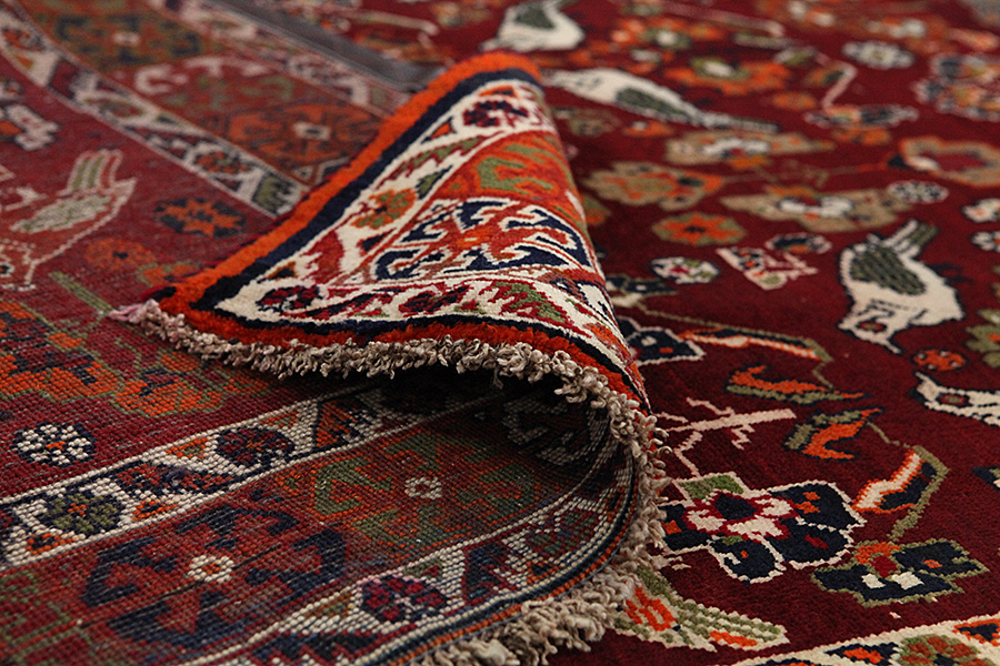 Tapis Qashqai: Les tapis Qashqai sont tissés par des nomades qui vivent à des régions montegnardes de Perse aux provinces de Fars, Kuzestan, au sud d’Isfahan et autour de la région de la ville Shiraz. Les tapis ont une grande densité en nœuds et une grande variété de dessins et en utilisant surtout le rouge profond et le bleu. Ils tissent des tapis, des kilims et des tissus décoratifs (des rubans, des sacs e.t.c) dans lesquels ils répresentent des instantanés de leur vie avec des représentations des hommes des animaux, des arbres et des fleurs. Aussi ils representent des images par des monuments historiques, surtout de Persepolis. Ils savent des dessins différents par cœur et ils tissent librement sans la contrainte sévère d’un dessin illustré.