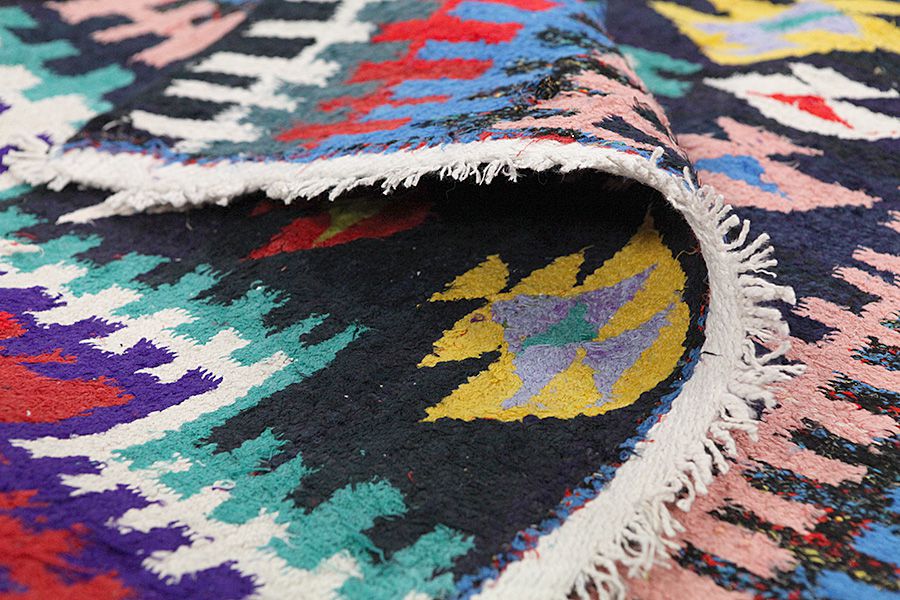 Tapis Kilim: C’est un type prècis du tapis-tissé sans velours (qui est le type précédent de celui avec le velours) et ils sont fabriqués surtout par des nomades en Perse, en Afghanistan, en Turquie et à des régions différentes de Caucasse. Il s’agit des tissés pas de grandes dimensions avec un tissage simple, sans velours. Ils ont comme des caractèristiques des figures géometriques et des associations des couleurs très riches. Des matières naturelles comme la laine sont utilisés pour le tissage et quelquefois aussi la soie pour les kilims plus legers et plus fins. Le chromatisme du fil est fait par des plantes et des métaux qui donnent de beaux nuances naturels. La tradition séculaire des kilims se perd aux siècles aux nomades d’Asie centrale. D’abord, les kilims étaient surtout des articles d’utilisation domestique et plus tard sont devenus des produits commercialisables en suivant les meilleurs techniques de la tapisserie d’ est pendant le 16ième et le 17ième siècle. Ils ont aussi plusieurs utilisations et ils peuvent être utilisés au plancher comme des couvertures ou pour décoration aux murs. Le nom Kilim vient du mot persan gelim. Ils s’appellent Berr en kurde. Les plus fameux kilims persans sont les kilims Sumakh, Senneh, Fars et Ghashghai. Des kilims afghans sont les kilims Golbariasta, Maimane, Taimani, Maliki e.t.c Plusiers kilims sont tissés aussi aux frontières entre la Perse et l’Afghanistan par des nomades de Balouch avec les couleurs foncées de Terre.