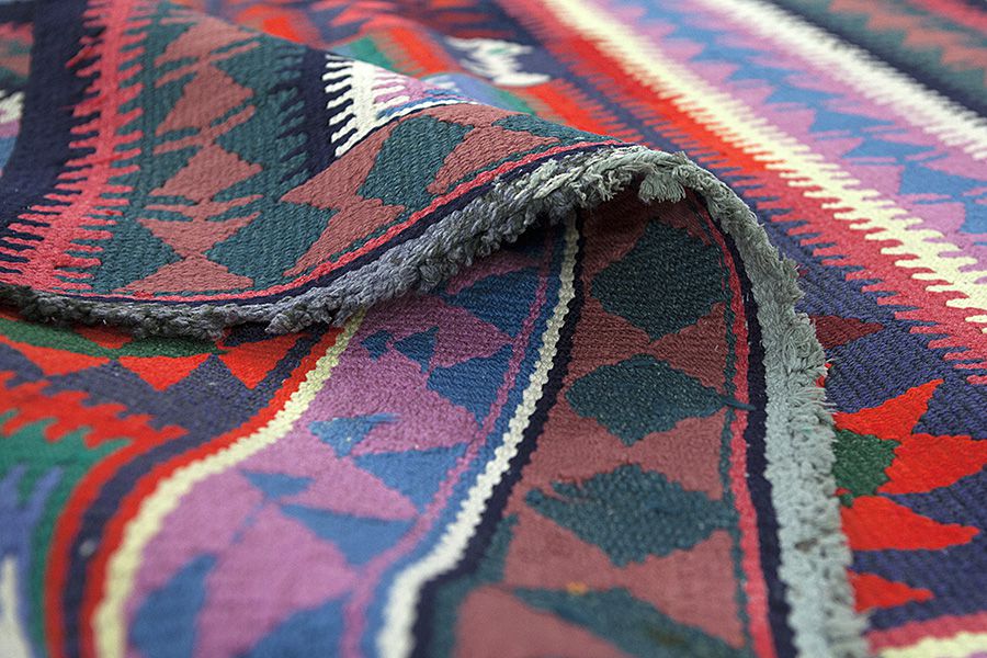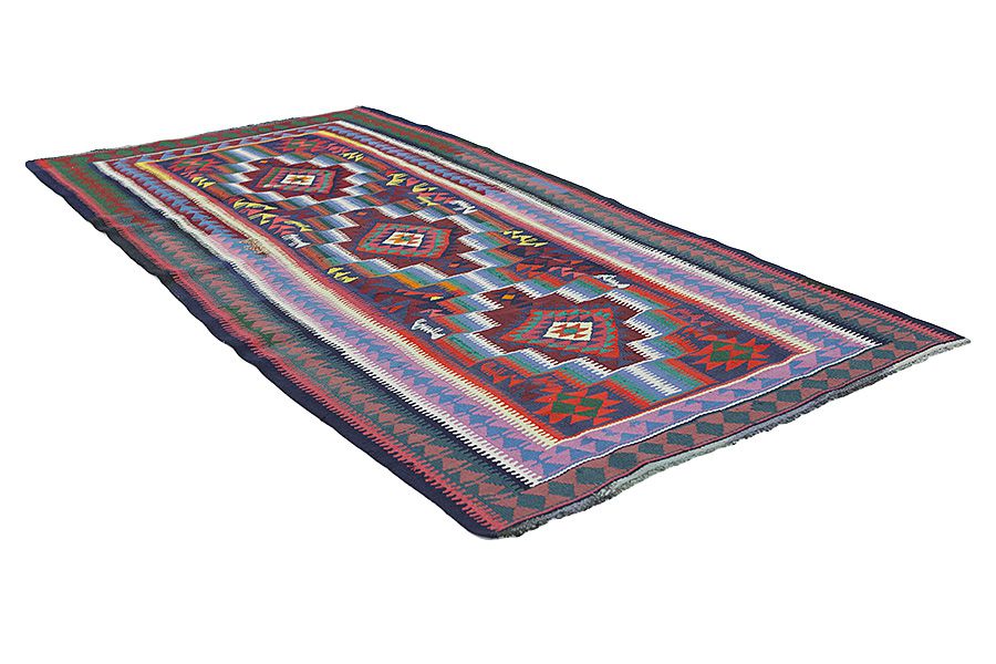 Tapis Kilim: C’est un type prècis du tapis-tissé sans velours (qui est le type précédent de celui avec le velours) et ils sont fabriqués surtout par des nomades en Perse, en Afghanistan, en Turquie et à des régions différentes de Caucasse. Il s’agit des tissés pas de grandes dimensions avec un tissage simple, sans velours. Ils ont comme des caractèristiques des figures géometriques et des associations des couleurs très riches. Des matières naturelles comme la laine sont utilisés pour le tissage et quelquefois aussi la soie pour les kilims plus legers et plus fins. Le chromatisme du fil est fait par des plantes et des métaux qui donnent de beaux nuances naturels. La tradition séculaire des kilims se perd aux siècles aux nomades d’Asie centrale. D’abord, les kilims étaient surtout des articles d’utilisation domestique et plus tard sont devenus des produits commercialisables en suivant les meilleurs techniques de la tapisserie d’ est pendant le 16ième et le 17ième siècle. Ils ont aussi plusieurs utilisations et ils peuvent être utilisés au plancher comme des couvertures ou pour décoration aux murs. Le nom Kilim vient du mot persan gelim. Ils s’appellent Berr en kurde. Les plus fameux kilims persans sont les kilims Sumakh, Senneh, Fars et Ghashghai. Des kilims afghans sont les kilims Golbariasta, Maimane, Taimani, Maliki e.t.c Plusiers kilims sont tissés aussi aux frontières entre la Perse et l’Afghanistan par des nomades de Balouch avec les couleurs foncées de Terre.