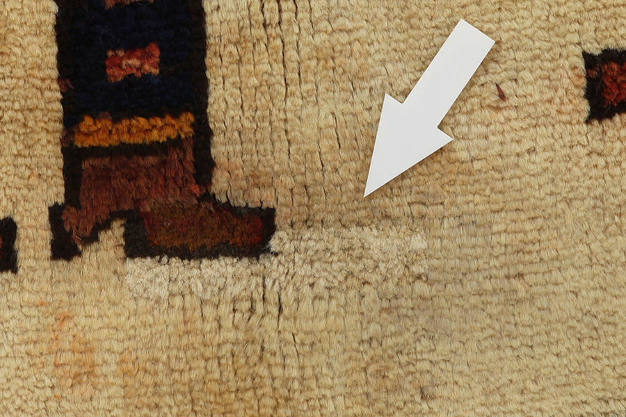Des ombrages horizontaux et verticaux au velours du tapis: Les ombrages sont dûs au pliage du tapis pendant son transport. Quand le tapis est déroulé et on le foule, ces ombrages vont être effacés. Exemples