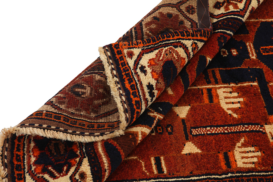 Tapis Qashqai: Les tapis Qashqai sont tissés par des nomades qui vivent à des régions montegnardes de Perse aux provinces de Fars, Kuzestan, au sud d’Isfahan et autour de la région de la ville Shiraz. Les tapis ont une grande densité en nœuds et une grande variété de dessins et en utilisant surtout le rouge profond et le bleu. Ils tissent des tapis, des kilims et des tissus décoratifs (des rubans, des sacs e.t.c) dans lesquels ils répresentent des instantanés de leur vie avec des représentations des hommes des animaux, des arbres et des fleurs. Aussi ils representent des images par des monuments historiques, surtout de Persepolis. Ils savent des dessins différents par cœur et ils tissent librement sans la contrainte sévère d’un dessin illustré.