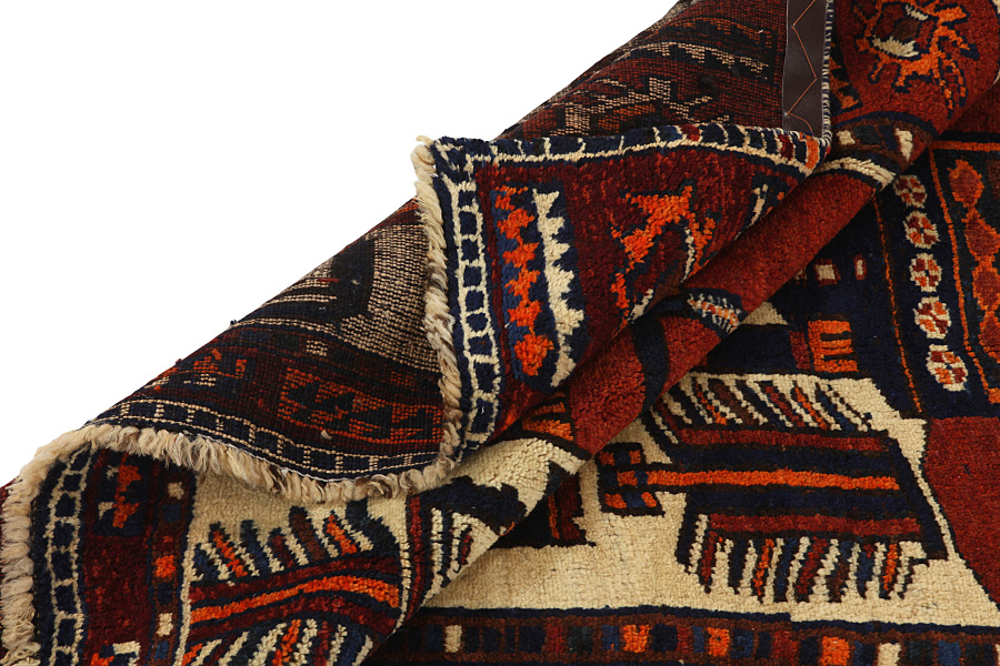 Tapis Qashqai: Les tapis Qashqai sont tissés par des nomades qui vivent à des régions montegnardes de Perse aux provinces de Fars, Kuzestan, au sud d’Isfahan et autour de la région de la ville Shiraz. Les tapis ont une grande densité en nœuds et une grande variété de dessins et en utilisant surtout le rouge profond et le bleu. Ils tissent des tapis, des kilims et des tissus décoratifs (des rubans, des sacs e.t.c) dans lesquels ils répresentent des instantanés de leur vie avec des représentations des hommes des animaux, des arbres et des fleurs. Aussi ils representent des images par des monuments historiques, surtout de Persepolis. Ils savent des dessins différents par cœur et ils tissent librement sans la contrainte sévère d’un dessin illustré.