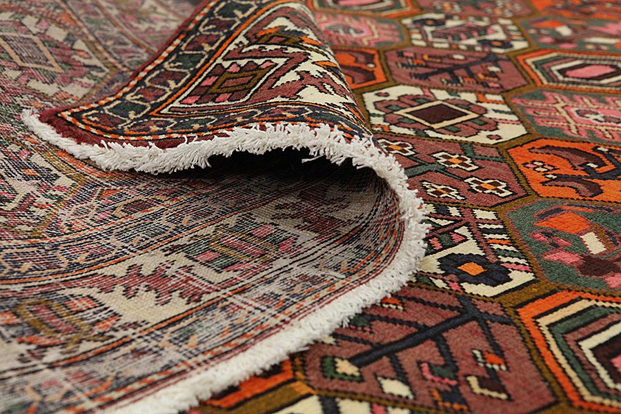Tapis Bakhtiari: Les nomades Bakhtiar habitent dans les montagnes Zagros à l’ouest de la ville d’Isfahan autour de la ville de Shar-e-kurd. Leurs tapis sont connus pour leurs dessins de différents carrés répétitifs dans lesquels sont représentés des fleurs ou des animaux, d’où l’origine du nom de ce motif « jardin » (Khesti). Leurs tapis sont aussi très résistants avec un tissage en laine perse de très bonne qualité issue de moutons élevés en haute altitude. Les meilleurs tapis Bakhtiar avec la meilleure densité de nœuds sont les Bibibaff.
