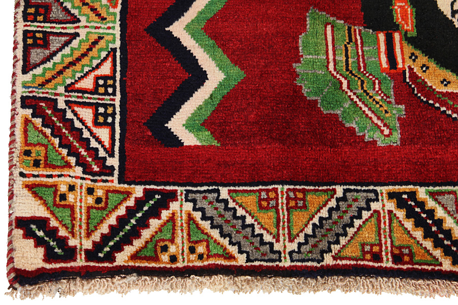Tapis Qashqai: Les tapis Qashqai sont tissés par des nomades qui vivent à des régions montegnardes de Perse aux provinces de Fars, Kuzestan, au sud d’Isfahan et autour de la région de la ville Shiraz. Les tapis ont une grande densité en nœuds et une grande variété de dessins et en utilisant surtout le rouge profond et le bleu. Ils tissent des tapis, des kilims et des tissus décoratifs (des rubans, des sacs e.t.c) dans lesquels ils répresentent des instantanés de leur vie avec des représentations des hommes des animaux, des arbres et des fleurs. Aussi ils representent des images par des monuments historiques, surtout de Persepolis. Ils savent des dessins différents par cœur et ils tissent librement sans la contrainte sévère d’un dessin illustré.