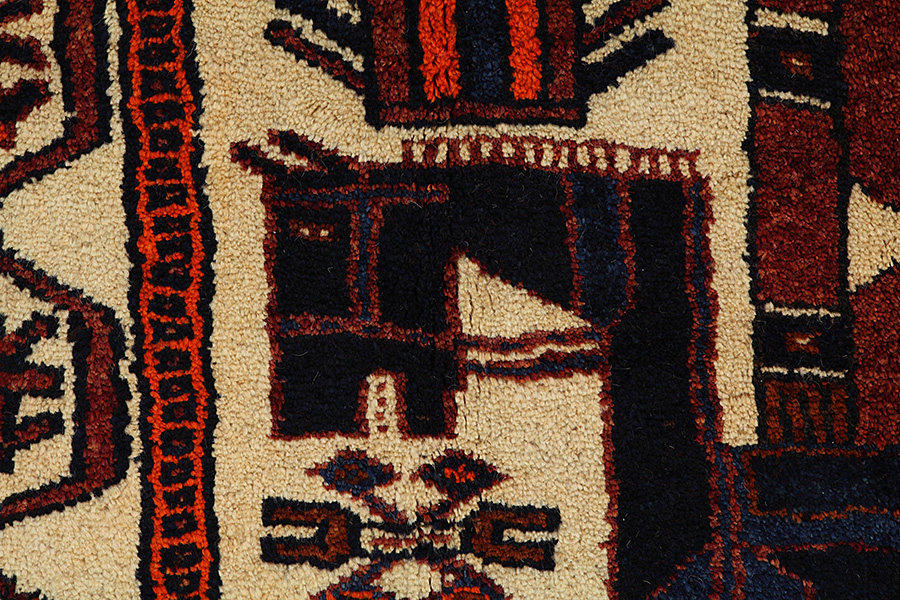 Tapis Qashqai: Les tapis Qashqai sont tissés par des nomades qui vivent à des régions montegnardes de Perse aux provinces de Fars, Kuzestan, au sud d’Isfahan et autour de la région de la ville Shiraz. Les tapis ont une grande densité en nœuds et une grande variété de dessins et en utilisant surtout le rouge profond et le bleu. Ils tissent des tapis, des kilims et des tissus décoratifs (des rubans, des sacs e.t.c) dans lesquels ils répresentent des instantanés de leur vie avec des représentations des hommes des animaux, des arbres et des fleurs. Aussi ils representent des images par des monuments historiques, surtout de Persepolis. Ils savent des dessins différents par cœur et ils tissent librement sans la contrainte sévère d’un dessin illustré.