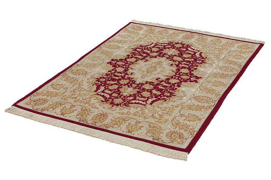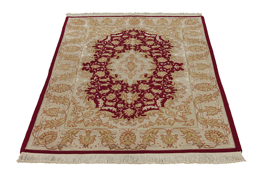 Tapis Tabriz: La ville Tabriz est la capitale de la province Azerbaïjan au sud-ouest d’Iran. Jusqu’à la fin de l’époque des caravanes Tabriz était le centre le plus important du commerce et du tissage des tapis. Par ici l’Ouest s’approvisionnait les chefs d’œuvres que des tisseurs renommés et capables tissent. Leurs qualités élevées ont fait les tapis connus aux marchés internationaux. Des atéliers des tapis noués à la main ont été crées où ils tissent de vieux et de nouveaux dessins avec une très grande densité en nœuds avec des matériaux de qualité excellente. La soie et la laine qualintative fine font les tapis de première classe. C’est la seule ville de Perse qui produit un si grand volume et et une si grande variété des tapis. Les tapis Tabriz sont impossants et ils ont leur style et leur originalité avec ou sans médaillon, avec des dessins pleins de l’imagination et de l’unicité des fleurs, des répresentations, des strophes, des poèmes à des couleurs comme le beige, le bleu et le rouge