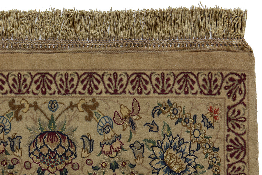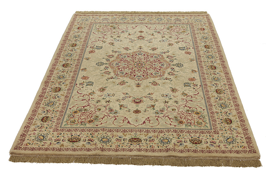 Tapis Ispahan: Au centre d’Iran entre les monts Zagros et le desert se trouve la ville d’Isfahan. Aujourd’hui c’est une ville très importante ville industrielle avec de 1,2 millions d’habitants. Au niveau architectural, la ville est un chef d’œuvre. La grande place Imam avec deux mosquées (Lotfollah et Ali Qapo) avec des palais, des parcs et des ponts vieux est entourée par des magasins avec des miniatures, des tapis, des bijouteries, des maisons de thé, qui créent l’ambiance d’Orient réel. Le grand bazaar s’étend de la partie nord de la place à une longueur de 5 km vers la mosquée Jame. Un proverbe ancien persan de 16ième siècle dit que Isfahan est le demi du monde. La ville Isfahan pendant la dynastie des Sarafides (1502-1629) était la capitale d’Iran ou le schah Abas avez rassemblé les meilleurs artisans des tapis noués à la main. Pendant cette periode là, les plus luxueux tapis ont été tissés. Ces tapis se trouvent à notre époque à des palais à des musées ou à la propriété des collecteurs connus à l’oposition de nouveau tapis n’avaient pas un médaillon centrale. Toute la surface du tapis est pleine de fleurs hélicoïdans artistiques et des flérons. Les plus nouveaux tapis Isfahan ne peuvent pas être comparés avec des vieux modèles exceptionnels qui étaient fabriqués exclusivement pour les bourgeois. En continuant la tradition, les tapis modernes d’Isfahan sont très fins à leur tissage et ils sont tondrus très bas pour relever mieux leur dessin. Ils utilisent aussi à leur tissage de la soie pour relever quelques parties du dessin surtout les fleurs. La chaîne est en soie ou en coton. Les dessins et le décor des tapis varient.