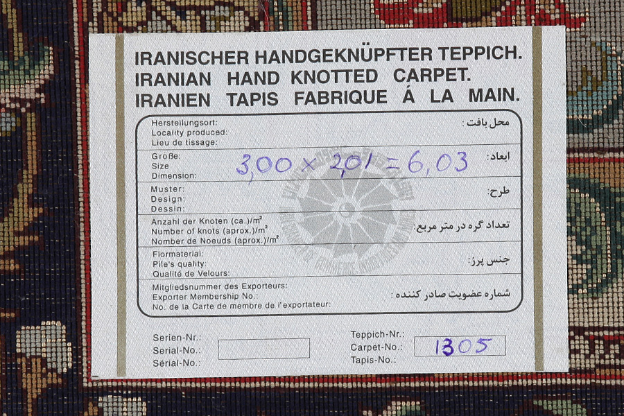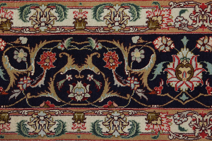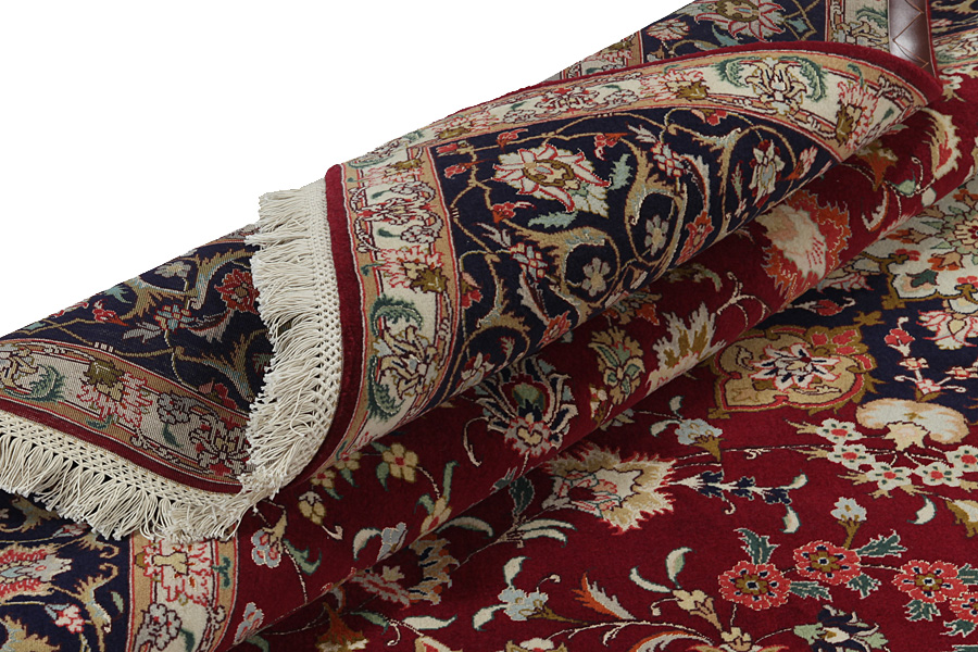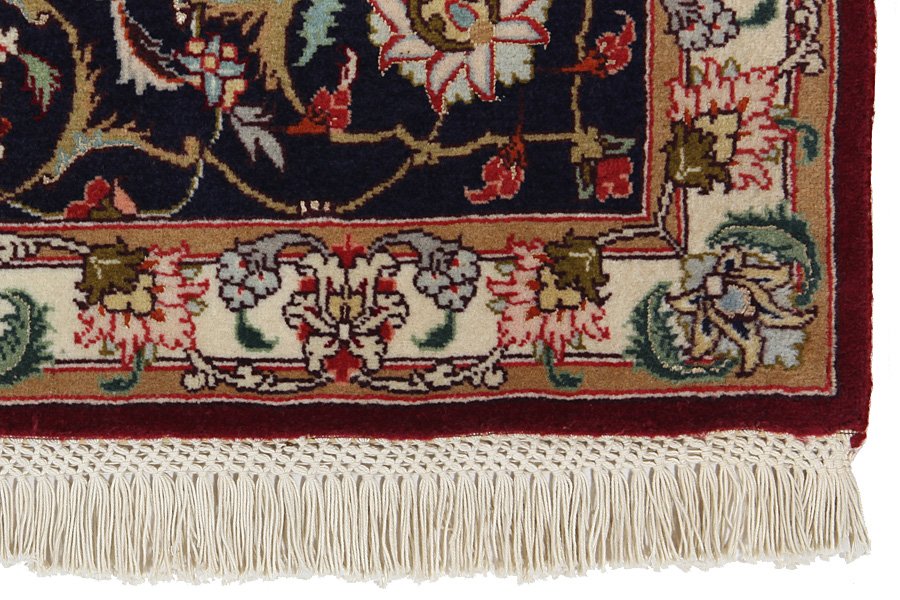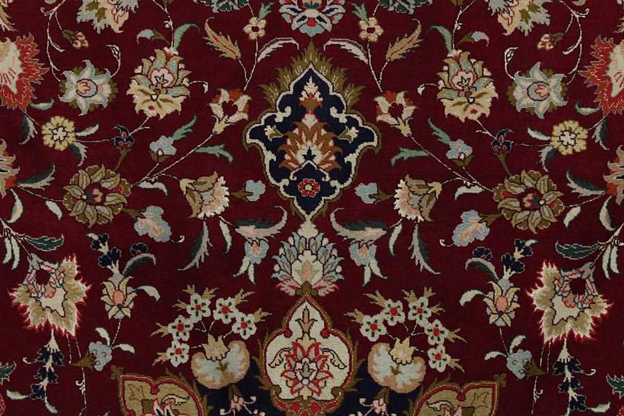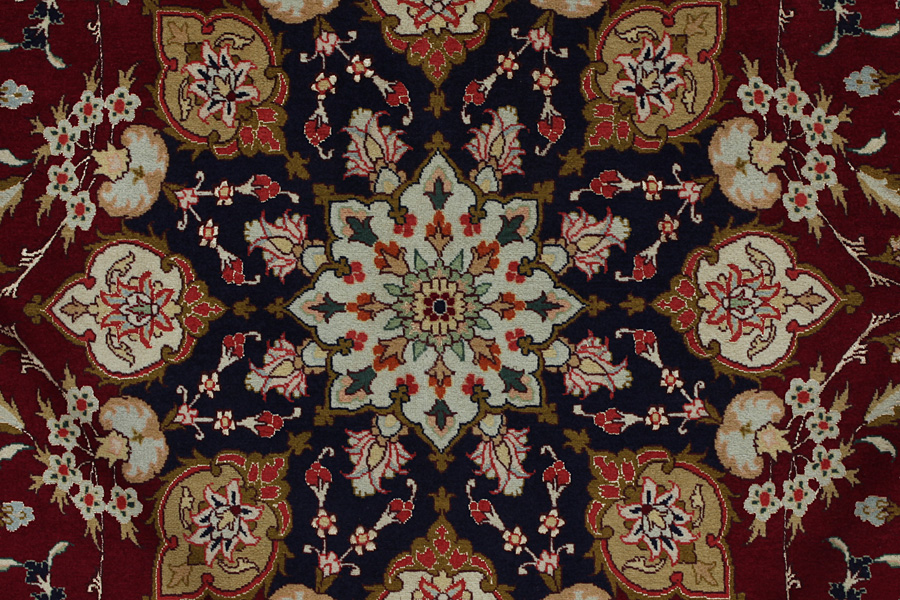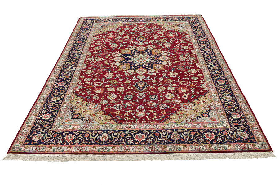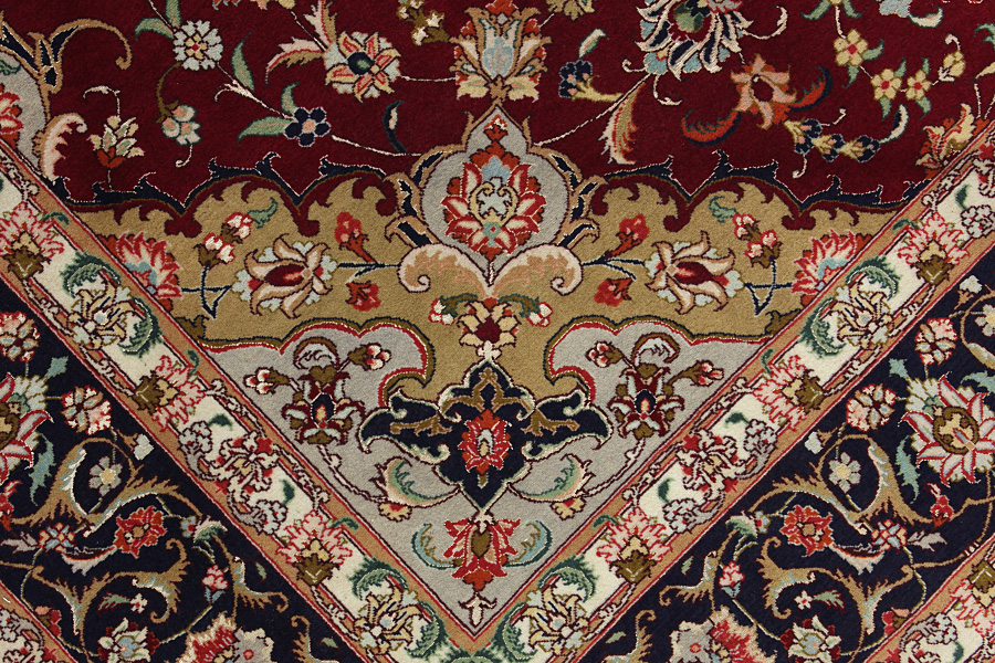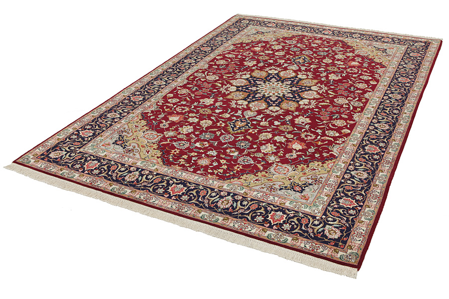 Tapis Tabriz: La ville Tabriz est la capitale de la province Azerbaïjan au sud-ouest d’Iran. Jusqu’à la fin de l’époque des caravanes Tabriz était le centre le plus important du commerce et du tissage des tapis. Par ici l’Ouest s’approvisionnait les chefs d’œuvres que des tisseurs renommés et capables tissent. Leurs qualités élevées ont fait les tapis connus aux marchés internationaux. Des atéliers des tapis noués à la main ont été crées où ils tissent de vieux et de nouveaux dessins avec une très grande densité en nœuds avec des matériaux de qualité excellente. La soie et la laine qualintative fine font les tapis de première classe. C’est la seule ville de Perse qui produit un si grand volume et et une si grande variété des tapis. Les tapis Tabriz sont impossants et ils ont leur style et leur originalité avec ou sans médaillon, avec des dessins pleins de l’imagination et de l’unicité des fleurs, des répresentations, des strophes, des poèmes à des couleurs comme le beige, le bleu et le rouge