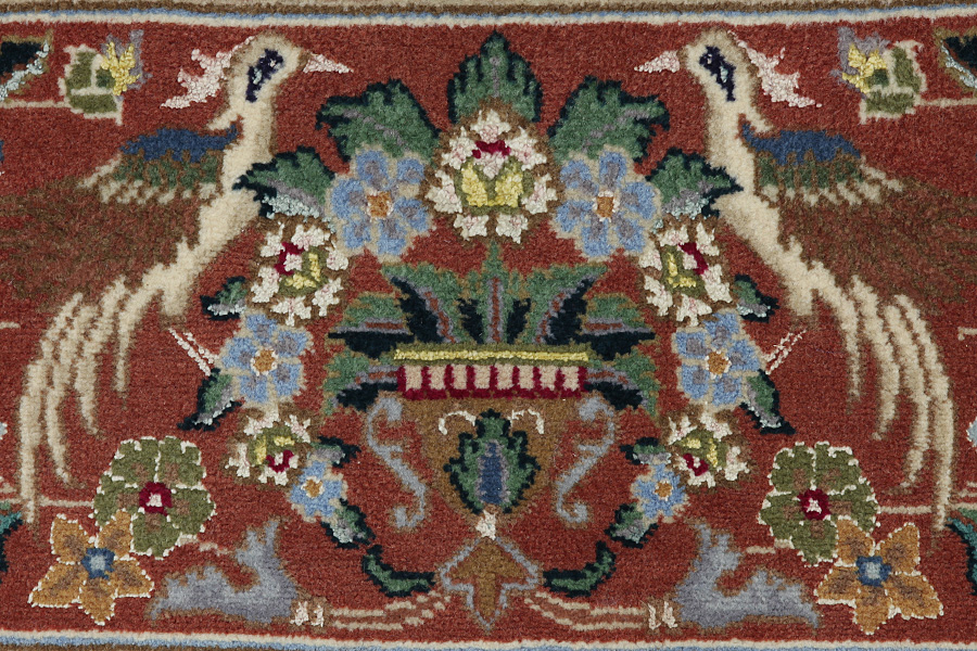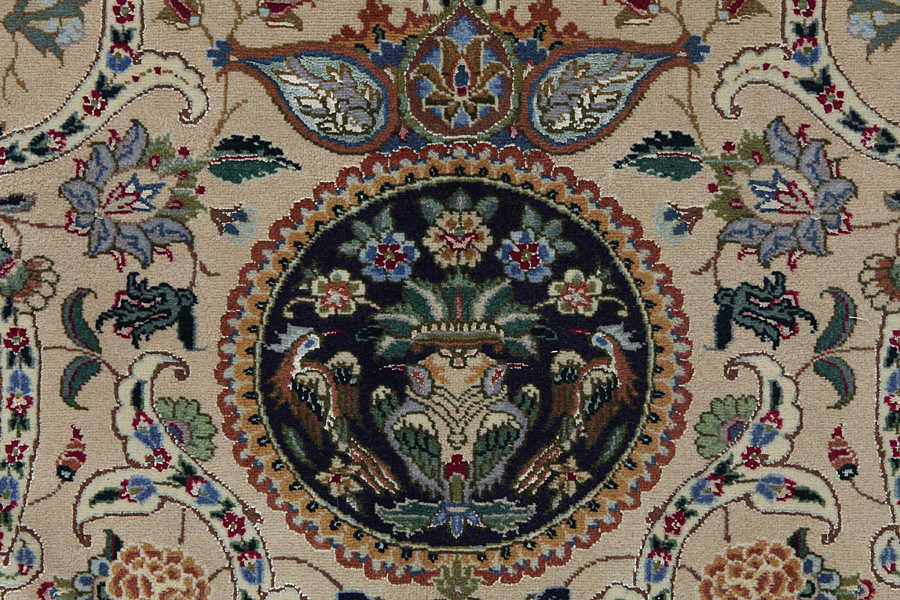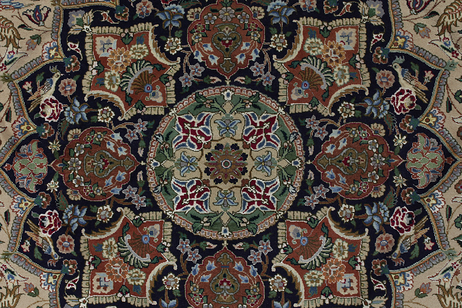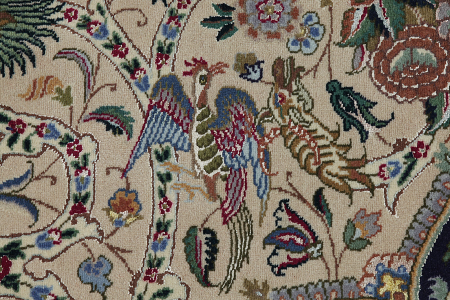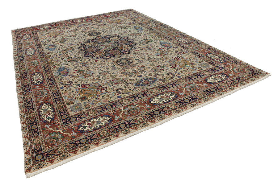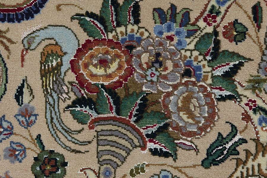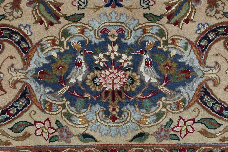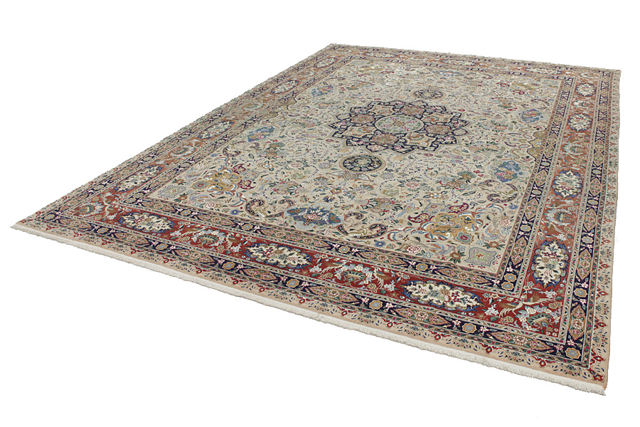 Tapis Tabriz: La ville Tabriz est la capitale de la province Azerbaïjan au sud-ouest d’Iran. Jusqu’à la fin de l’époque des caravanes Tabriz était le centre le plus important du commerce et du tissage des tapis. Par ici l’Ouest s’approvisionnait les chefs d’œuvres que des tisseurs renommés et capables tissent. Leurs qualités élevées ont fait les tapis connus aux marchés internationaux. Des atéliers des tapis noués à la main ont été crées où ils tissent de vieux et de nouveaux dessins avec une très grande densité en nœuds avec des matériaux de qualité excellente. La soie et la laine qualintative fine font les tapis de première classe. C’est la seule ville de Perse qui produit un si grand volume et et une si grande variété des tapis. Les tapis Tabriz sont impossants et ils ont leur style et leur originalité avec ou sans médaillon, avec des dessins pleins de l’imagination et de l’unicité des fleurs, des répresentations, des strophes, des poèmes à des couleurs comme le beige, le bleu et le rouge