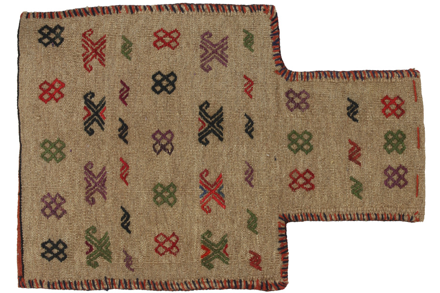 Tapis Saddle Bag: ​​Les sacs pour selle à cheval sont faits par les Nomades pour les utiliser eux-mêmes. Il existe 2 types de sacs :les sacs pour selle-kilim et des sacs pour selle noués. Le coté avant d’un sac est soit noué avec des nœuds (comme un tapis) soit utilise des techniques différentes. Le côté derrière est souvent noué alors que pour le centre du sac des techniques différentes (comme par exemple la technique Soumak) sont appliquées. Les couleurs avec lesquelles les sacs sont teints sont toutes naturelles et faites par les Nomades eux-mêmes. Les voyageurs utilisaient ces sacs pour transporter des denrées quotidiennes à cheval ou à dos d' âne. Il s'agit d'une pièce d’art exceptionnelle qui peut apporter une ambiance orientale unique chez-vous. Ces sacs peuvent être utilisés comme coussins d'assise, comme poufs au sol (par exemple près de la cheminée) ou pour décorer vos murs. De plus ces petits sacs pour selle de cheval peuvent être utilisés pour stocker vos journaux ou vos magazines.