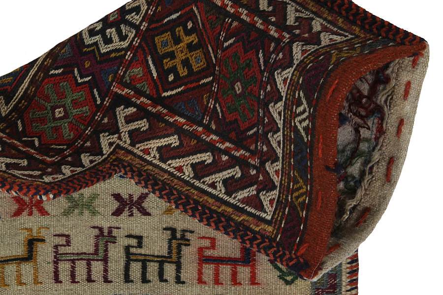 Tapis Saddle Bag: ​​Les sacs pour selle à cheval sont faits par les Nomades pour les utiliser eux-mêmes. Il existe 2 types de sacs :les sacs pour selle-kilim et des sacs pour selle noués. Le coté avant d’un sac est soit noué avec des nœuds (comme un tapis) soit utilise des techniques différentes. Le côté derrière est souvent noué alors que pour le centre du sac des techniques différentes (comme par exemple la technique Soumak) sont appliquées. Les couleurs avec lesquelles les sacs sont teints sont toutes naturelles et faites par les Nomades eux-mêmes. Les voyageurs utilisaient ces sacs pour transporter des denrées quotidiennes à cheval ou à dos d' âne. Il s'agit d'une pièce d’art exceptionnelle qui peut apporter une ambiance orientale unique chez-vous. Ces sacs peuvent être utilisés comme coussins d'assise, comme poufs au sol (par exemple près de la cheminée) ou pour décorer vos murs. De plus ces petits sacs pour selle de cheval peuvent être utilisés pour stocker vos journaux ou vos magazines.