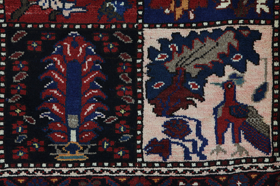 Tapis Bakhtiari: Les nomades Bakhtiar habitent dans les montagnes Zagros à l’ouest de la ville d’Isfahan autour de la ville de Shar-e-kurd. Leurs tapis sont connus pour leurs dessins de différents carrés répétitifs dans lesquels sont représentés des fleurs ou des animaux, d’où l’origine du nom de ce motif « jardin » (Khesti). Leurs tapis sont aussi très résistants avec un tissage en laine perse de très bonne qualité issue de moutons élevés en haute altitude. Les meilleurs tapis Bakhtiar avec la meilleure densité de nœuds sont les Bibibaff.