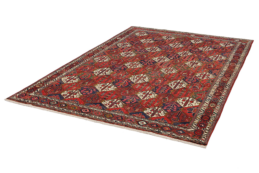 Tapis Bakhtiari: Les nomades Bakhtiar habitent dans les montagnes Zagros à l’ouest de la ville d’Isfahan autour de la ville de Shar-e-kurd. Leurs tapis sont connus pour leurs dessins de différents carrés répétitifs dans lesquels sont représentés des fleurs ou des animaux, d’où l’origine du nom de ce motif « jardin » (Khesti). Leurs tapis sont aussi très résistants avec un tissage en laine perse de très bonne qualité issue de moutons élevés en haute altitude. Les meilleurs tapis Bakhtiar avec la meilleure densité de nœuds sont les Bibibaff.
