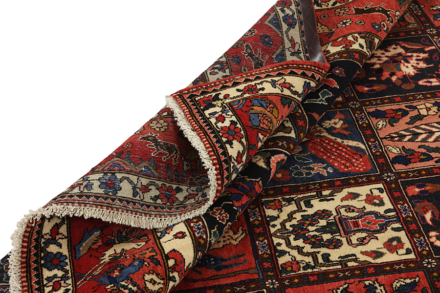 Tapis Bakhtiari: Les nomades Bakhtiar habitent dans les montagnes Zagros à l’ouest de la ville d’Isfahan autour de la ville de Shar-e-kurd. Leurs tapis sont connus pour leurs dessins de différents carrés répétitifs dans lesquels sont représentés des fleurs ou des animaux, d’où l’origine du nom de ce motif « jardin » (Khesti). Leurs tapis sont aussi très résistants avec un tissage en laine perse de très bonne qualité issue de moutons élevés en haute altitude. Les meilleurs tapis Bakhtiar avec la meilleure densité de nœuds sont les Bibibaff.